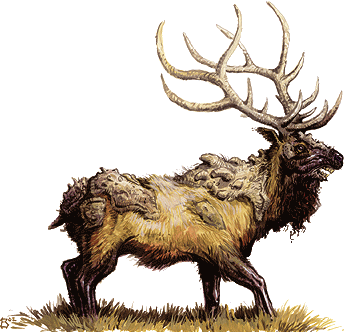 I'd barely had time to catch my breath when the being returned. But this time he was not alone; he had brought with him an enormous elk. I looked into its eyes, and it looked into mine. Then I looked into my eyes looking into... oh! I was linked to the elk, it was my mount! I shook my head to clear my thoughts and the elk shook its head in perfect sync with me. (His, definately his. Very odd sensations from the link.)